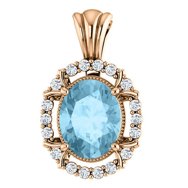 This beautiful 14 Karat Rose Gold Aquamarine & 0.17 Carat Total Weight Diamond Pendant is set with selected fine genuine aquamarine and set with the highest craftsmanship standards in 14kt Rose gold