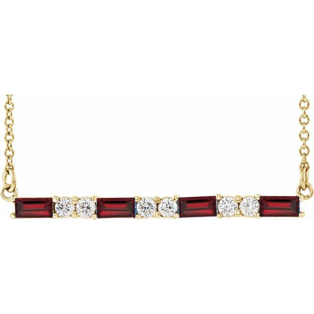 This beautiful 14 Karat Yellow Gold Garnet & 1/5 Carat Diamond Bar 16 inch Necklace - Eye-Catching Straight Baguette Garnet Necklace is a timeless jewelry item made in the highest standards for Gemstone Fashion jewelry