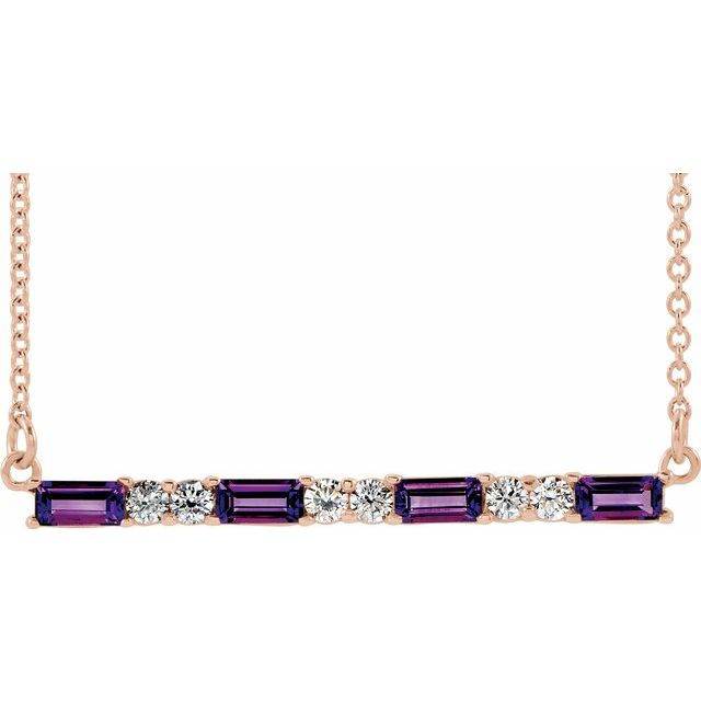 This beautiful 14 Karat Rose Gold Amethyst & 1/5 Carat Diamond Bar 16 inch Necklace - Attractive Straight Baguette Amethyst Necklace is a timeless jewelry item made in the highest standards for Gemstone Fashion jewelry