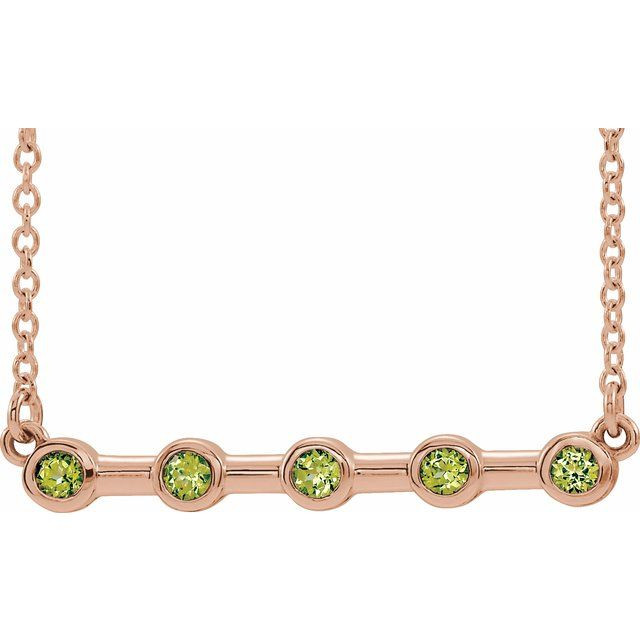 This beautiful 14 Karat Rose Gold Peridot Bezel-Set Bar 16 inch Necklace - Splendid Round Peridot Necklace is a timeless jewelry item made in the highest standards for Gemstone Fashion jewelry
