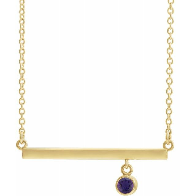 This beautiful 14 Karat Yellow Gold Amethyst Bezel-Set 16 inch Bar Necklace - Exquisite Round Amethyst Necklace is a timeless jewelry item made in the highest standards for Gemstone Fashion jewelry