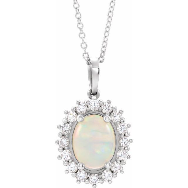 This beautiful 14 Karat White Gold Ethiopian Opal & 1/3 Carat Diamond Halo-Style 16 inch Necklace - Nice Oval Opal Necklace is a timeless jewelry item made in the highest standards for Gemstone Fashion jewelry