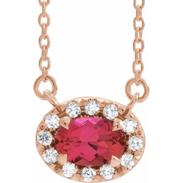Lab Ruby Gem in 14 Karat Rose Gold 5x3 mm Oval Lab Ruby and .05 Carat Diamond 16 inch Necklace