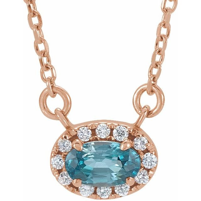 This beautiful 14 Karat Rose Gold 7x5 mm Oval Blue Zircon & 1/6 Carat Diamond 16 inch Necklace - Ravishing Oval Zircon Necklace is a timeless jewelry item made in the highest standards for Gemstone Fashion jewelry