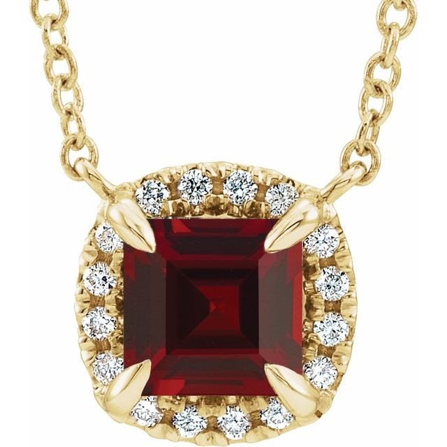 This beautiful 14 Karat Yellow Gold 4x4 mm Square Mozambique Garnet & .05 Carat Diamond 16 inch Necklace - Graceful Square Garnet Necklace is a timeless jewelry item made in the highest standards for Gemstone Fashion jewelry