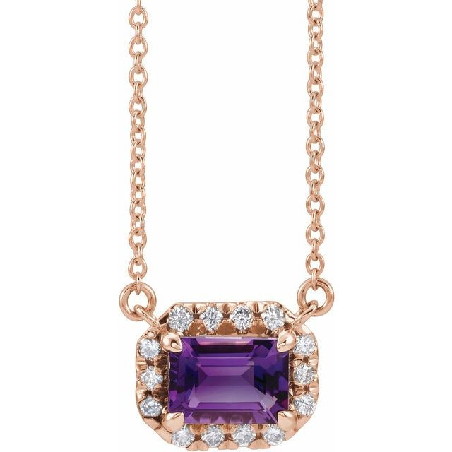 Amethyst Necklace in 14 Karat Rose Gold 5x3 mm Emerald Amethyst and 0.12 Carat Diamond 16 inch Necklace