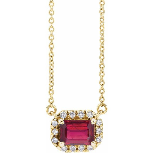 Created Ruby Necklace in 14 Karat Yellow Gold 6x4 mm Emerald Lab Ruby and 0.20 Carat Diamond 16 inch Necklace