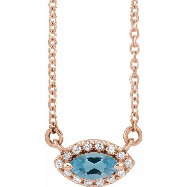 This beautiful 14 Karat Rose Gold Blue Zircon & .05 Carat Diamond Halo-Style 18 inch Necklace - Attractive Marquise Zircon Necklace is a timeless jewelry item made in the highest standards for Gemstone Fashion jewelry