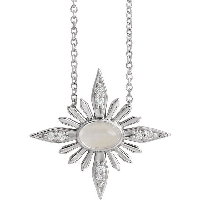 This beautiful Platinum Rainbow Moonstone & .08 Carat Diamond Celestial 16 inch Necklace - Eye-Catching Oval Moonstone Necklace is a timeless jewelry item made in the highest standards for Gemstone Fashion jewelry