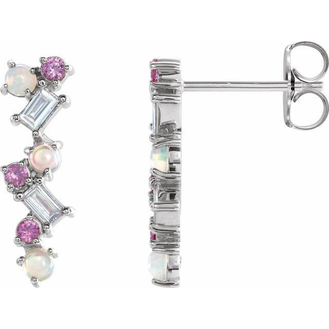 This beautiful 14 Karat White Gold Ethiopian Opal, Pink Sapphire & 0.10 Carat Diamond Scattered Bar Earrings - Exquisite Multi-Gemstone Earrings is a timeless jewelry item made in the highest standards for Gemstone Fashion jewelry