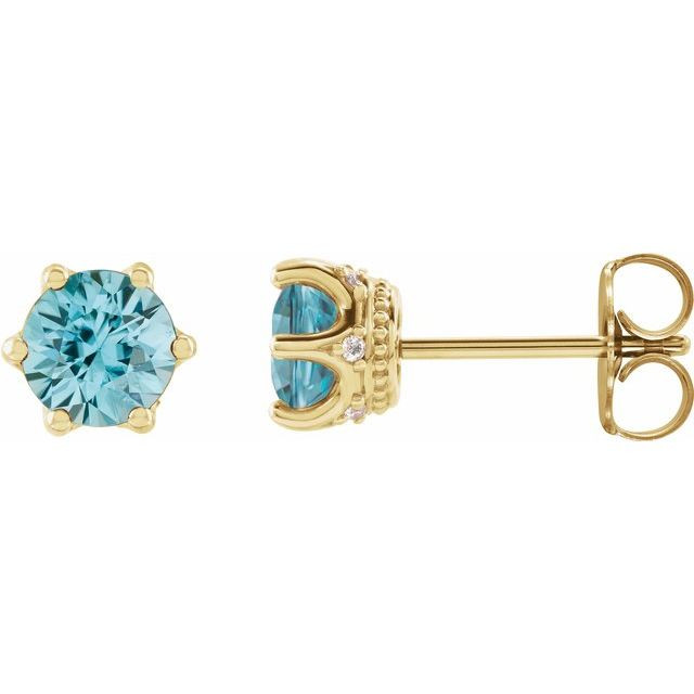 14 Karat Yellow Gold 4 mm Natural Blue Zircon and .03 Carat Natural Diamond Crown Earrings