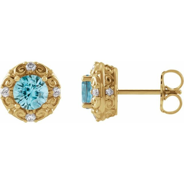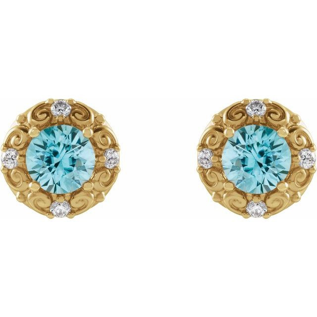 14 Karat Yellow Gold 5 mm Natural Blue Zircon & 0.16 Carat Natural Diamond Halo-Style Earrings Comes Set With
