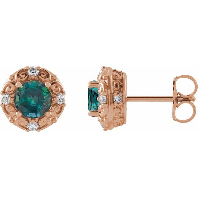 14 Karat Rose Gold 5 mm Lab-Grown Alexandrite & 0.16 Carat Natural Diamond Halo-Style Earrings Comes Set With