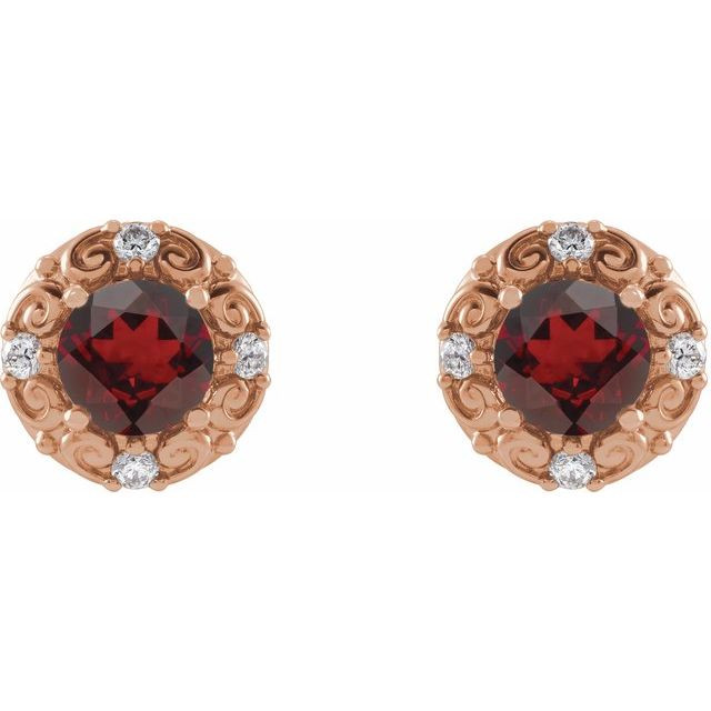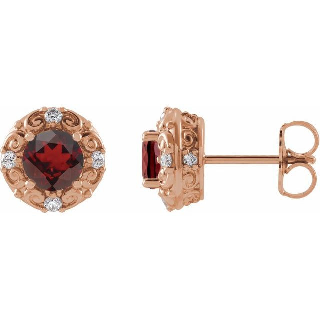 14 Karat Rose Gold 5 mm Natural Mozambique Garnet & 0.16 Carat Natural Diamond Halo-Style Earrings Comes Set With