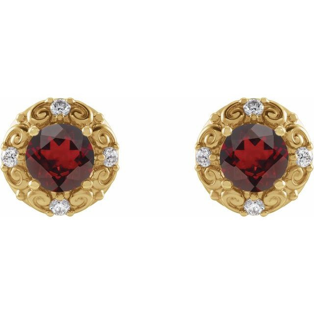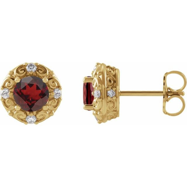 14 Karat Yellow Gold 5 mm Natural Mozambique Garnet & 0.16 Carat Natural Diamond Halo-Style Earrings Comes Set With