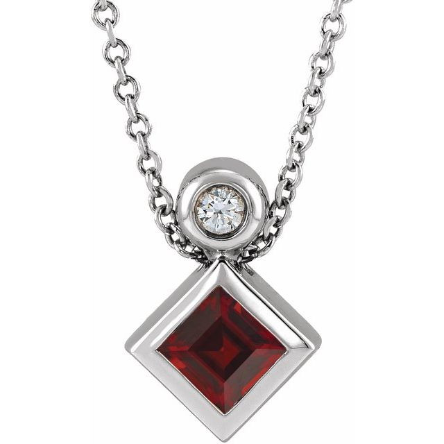 Platinum 4 mm Square Natural Mozambique Garnet and .03 Carat Natural Diamond 16 inch Necklace