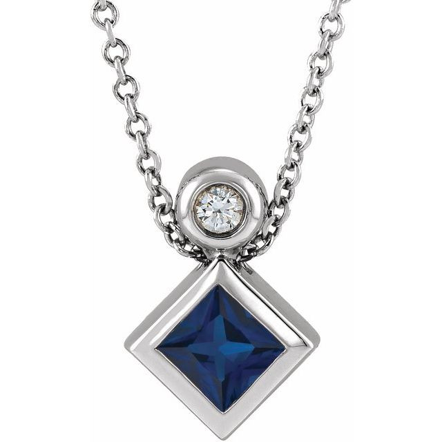 Platinum 4x4 mm Square Lab-Grown Blue Sapphire & .03 CT Natural Diamond 16 inch Necklace Comes Set With