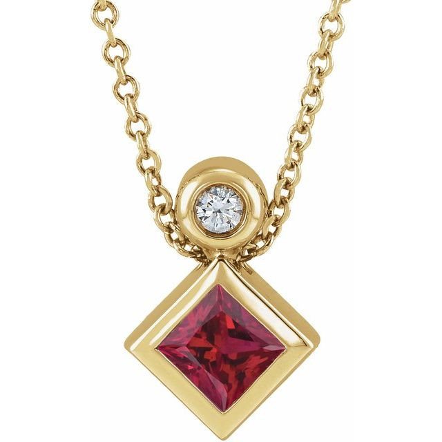 14 Karat Yellow Gold 4 mm Square Lab Grown Ruby and .03 Carat Natural Diamond 16 inch Necklace