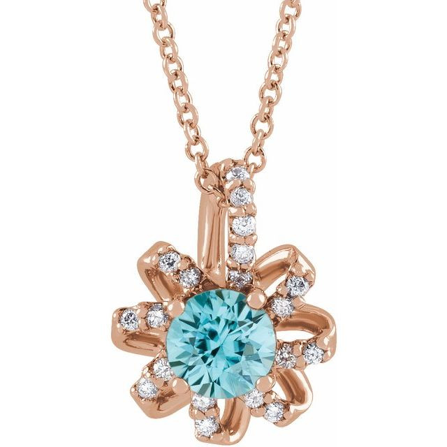 14 Karat Rose Gold Natural Blue Zircon & .07 Carat Natural Diamond Halo-Style 16 inch Necklace Comes Set With