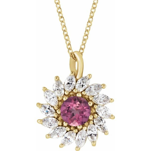 14 Karat Yellow Gold Pink Tourmaline and 0.60 Carat Diamond Halo Style 16 inch Necklace