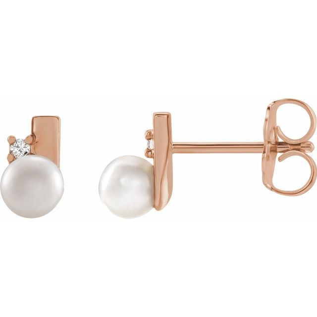 14 Karat Rose Gold Cultured Akoya Pearl and .03 Carat Diamond Geometric Earrings