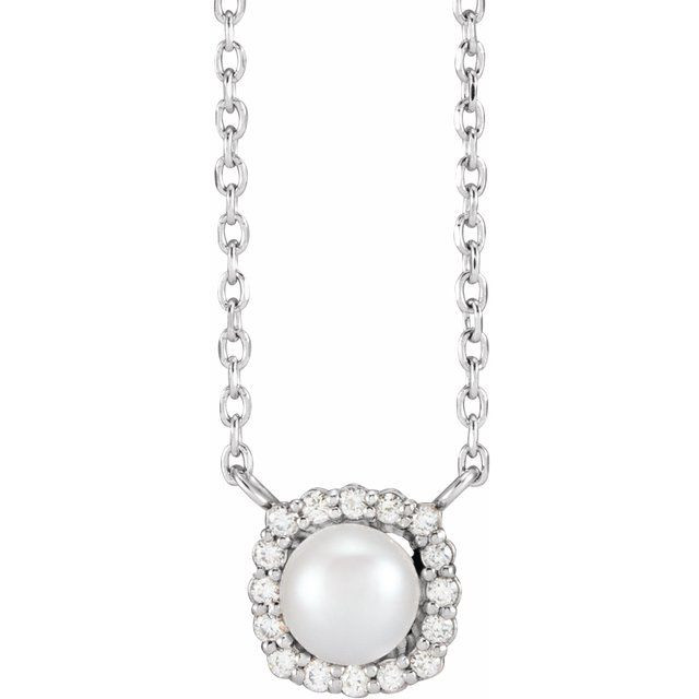 14 Karat White Gold Cultured White Akoya Pearl .06 Carat Diamond Halo Style 18 inch Necklace