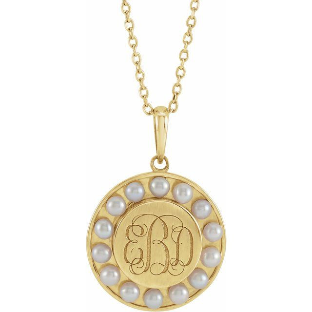 14 Karat Yellow Gold Cultured White Seed Pearl Engravable Halo-Style 16 inch Necklace Comes Set With