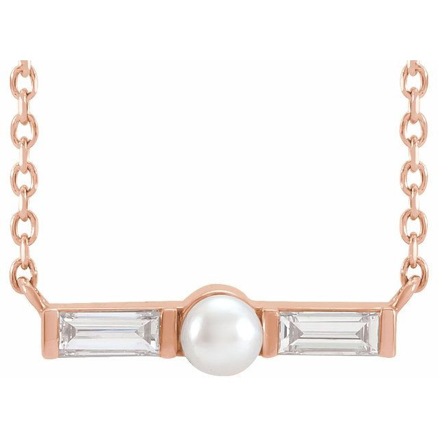 14 Karat Rose Gold Cultured Seed Pearl & 0.16 Carat Natural Diamond Petite Bar 18 inch Necklace Comes Set With
