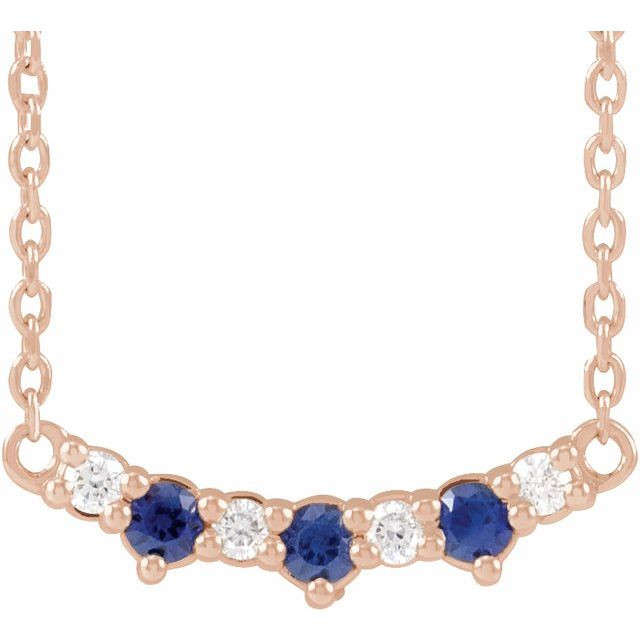14 Karat Rose Gold Lab Grown Blue Sapphire & .05 Carat Natural Diamond Three-Stone Bar 18 inch Necklace Comes Set With