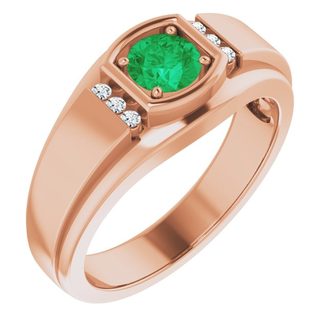 14 Karat Rose Gold Emerald & .08 Carat Diamond Men's Ring - Splendid Round Emerald Ring is a timeless jewelry item made in the highest standards for Gemstone Fashion jewelry