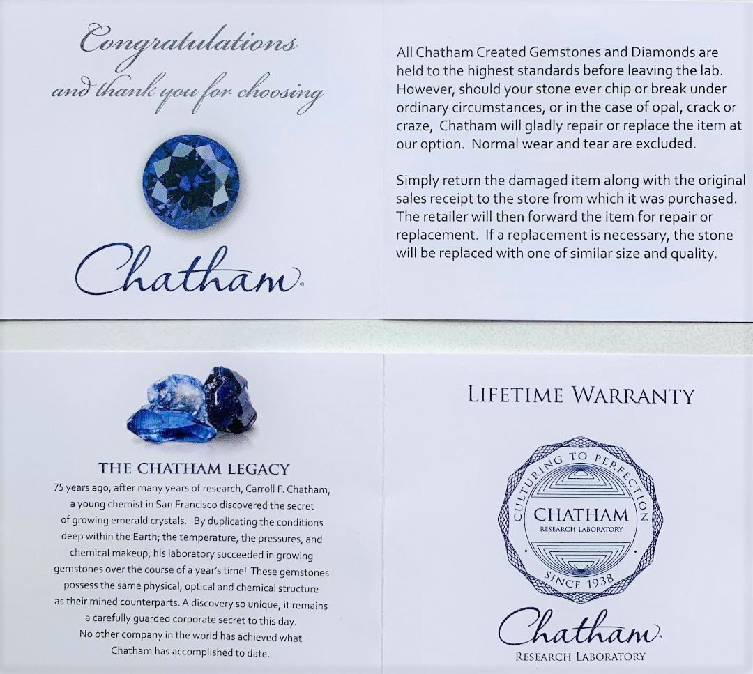 Genuine Chatham gemstones mimic their mined gemstone counterparts in all respects, appearance, refractive index, optical characteristics, hardness and all other physical properties. It is the finest grade that Chatham offers. It has been faceted to a very high professional lapidary standard and has a very good make, polish and symmetry. It has a clarity rating of Eye Clean Plus.