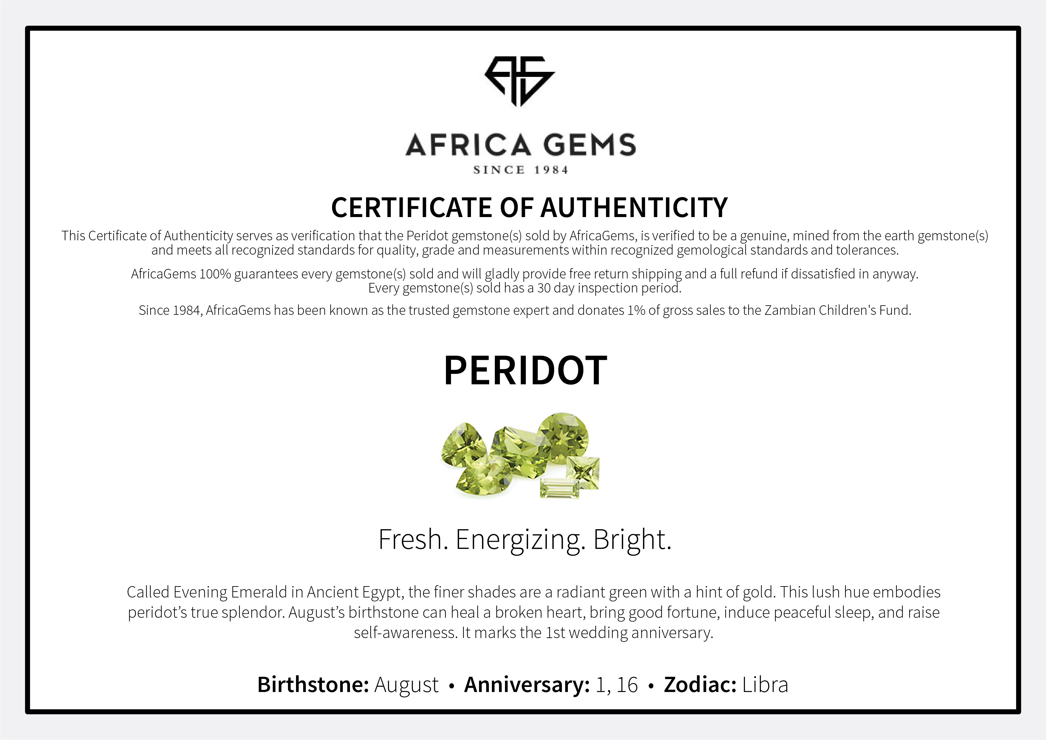 AfricaGems 'This gemstone is sold with a Gemstone Grading Analysis issued by AfricaGems' GIA 'This gemstone is sold with a gemological certificate done by the GIA (Gemological Institute of America) gemological laboratory.' GRS 'This gemstone is sold with a gemological certificate done by the GRS (Gem Research Swiss Lab)Gem Research Swiss Laboratory) gemological laboratory.' AGTA 'This gemstone is sold with a gemological certificate done by the AGTA (American Gem Trade Association) gemological laboratory.' GIT 'This gemstone is sold with a gemological certificate done by the GIT (Gem and Jewelry Institute of Thailand)gemological laboratory.'