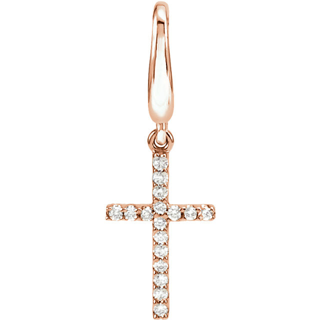 This beautiful 14 Karat Rose Gold .08 Carat Total Weight Diamond Petite Cross Charm is set with selected fine genuine diamond and set with the highest craftsmanship standards in 14kt Rose gold