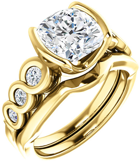 So Unique! This Engagement Ring Mounting Features Gypsy Set Round Accents, Three On Each Side of the Band Sized 2.20 mm, 2.50 mm and 2.70 mm, That get Increasingly Larger As They Approach the Center Gemstone. The Centergemstone is Channel Set, Giving it a Contemporary Feel.