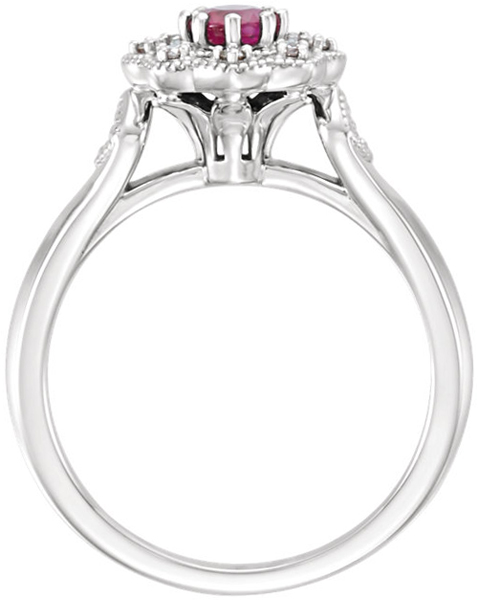 Intricate Milgrain Metal Detailing and Diamond Accents Create an Ornate Scalloped Frame Around a Stunning AA Grade 4.00 mm Round Ruby Gemstone in This Fabulous Ring. Choose 14kt White, Yellow or Rose Gold. is set with selected fine genuine ruby and set with the highest craftsmanship standards in 14kt white gold